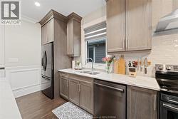 Welcome to 387 Caserta, fully finished 5-bed, 3-bath, built by Lakeland Homes (2021), right across from St Anne's High School. Walking through the front door, you're greeted with an elegant Wayne Scotting design throughout, an open living room and kitchen with tons of natural light, recessed ceiling, a built-in fireplace console, an upgraded kitchen with quartz countertops & a separate island. Sliding glass door opens to a covered back porch perfect for your morning coffee. Main floor laundry room with 2 bedrooms and 2 full bathrooms. Master bedroom en-suite with a double-bowl vanity and walk-in closet. The finished lower level features 3 additional bedrooms, full bathroom, and a large, cozy living room. Energy efficient with upgraded HRV & Tankless HWT. Double-car attached garage. All appliances included. Walking distance to St Anne's Highschool, River Ridge Park, Atlas Tube Recreation Centre, with easy driving to Detroit River, E.C Row Expressway shopping centres and retail. (id:27)