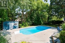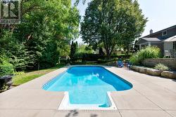 Set well back off the street on an oversized 80 x 140 foot treed lot in north London's highly sought after Masonville neighbourhood is this lovingly cared for and tastefully updated family home, a short sidewalk stroll from Masonville Public School, one of the regions top ranked schools. This homes family friendly layout has been modernized with an open concept kitchen, dining and family room and includes a wall of windows to the stunning private back yard with two tiered concrete patios and pool. New custom designed kitchen (16), with gorgeous Quartz counters, sprawls with plenty of storage and counter space and includes a two-seat peninsula, separate wet bar with beverage fridge, full size stainless-steel fridge & freezer and a built-in corner bench dinette seating overlooking a composite rear deck, ideal for BBQing. The spacious family room has soaring vaulted ceiling and cozy gas fireplace with brick surround. Main floor study with French doors includes custom double desk and built-in shelves. Hardwood floors are throughout the main and second floors with slate floor foyer and tiled bathrooms floors. Upstairs there are four good sized bedrooms. The primary suite is complete with walk-in closet and updated ensuite bathroom with glass shower. Finished lower level includes insulated dry-core flooring in the rec-room, games room and laundry room. An additional 2pc bathroom in the lower level is next to a separate door & staircase to the backyard patio for convenient access from the pool. Additional upgrades include new windows (01) and vinyl siding, roof and additional insulation in 2020. This incredible location is only a 10-minute walk to Masonville Place, 18 minutes to University Hospital, 21 minutes to Western University and only 5 minutes to Helen Mott Shaw Park. With concrete driveway, walkways, patios and extensive landscaping this home truly has it all. Book your viewing today. (id:27)