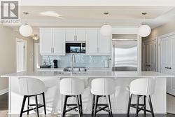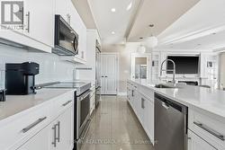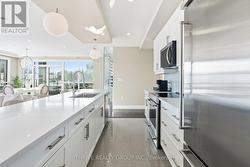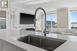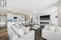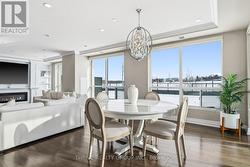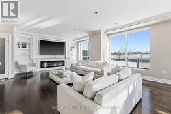 An exceptional executive residence offering the scale, privacy, and outdoor living of a penthouse-without high floors or long elevator wait times. This beautifully upgraded suite features 1,615 sq. ft. of refined interior space paired with a rare 2,342 sq. ft. exclusive-use terrace, creating an outstanding indoor-outdoor lifestyle.The open-concept Great Room is ideal for everyday living and elegant entertaining, seamlessly integrating generous living and dining areas with a striking chef's kitchen, all surrounded by expansive windows and natural light. Premium finishes include hardwood and porcelain tile flooring, extensive pot lighting, upgraded fixtures, and heated bathroom floors.The gourmet kitchen offers ceiling-height white cabinetry, quartz countertops, stainless steel appliances including a built in counter-depth refrigerator, designer tile backsplash, an oversized 12-foot island with seating for four, and a walk-in pantry. The living area features custom built-ins and an extended linear fireplace, with the dining space accented by a glass-enclosed wine display. The primary bedroom retreat accommodates a king-size bed and includes a walk-in closet and a spa-inspired five-piece ensuite with granite countertops, double vanity, glass and tile shower, soaker tub, and heated floors. The second bedroom is ideal as a guest suite or home office. A three-season Lumon sunroom with floor-to-ceiling retractable glass and UV protection extends year-round enjoyment. Outdoor living is exceptional, with a south-facing terrace featuring astroturf and cedar hedge border, plus an expansive open patio with eastern exposure-perfect for entertaining and sunrise views.Includes four underground parking spaces and an owned storage locker. Building amenities include an indoor pool, fitness centre, dining room, billiards room, library/lounge, and theatre. Desirable North London location near shopping, golf, hospitals, and nature trails. Condo fees include heat and air conditioning. (id:27)