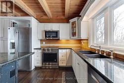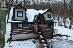 Log Cabin - Gorgeous 3 bedroom 3 bathroom Chalet on a large deep lot with views of Georgian Bay. Located just west of Thornbury and Christie Beach Road this property features an open concept Kitchen/Living/Dining area stainless appliance, granite counters, a wood burning floor to ceiling stone fireplace, hard wood floors, main floor Primary with ensuite, two additional bedrooms with Den on the upper level, a rec-room and full bathroom on the ground level. The main floor opens to a large private deck, hot tub and hard wood forest, there is also an attached oversized single car garage. Just minutes from the water and perched up high for views and privacy this is the perfect get away, close to Christie Beach, Thornbury, Meaford, Restaurants, Parks, Golf, Skiing, Cycling, the Georgian Trail and all the areas amenities. (id:27)