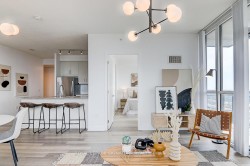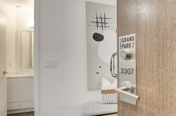 Perched high above the city on the 33rd floor in the highly sought-after Grand Park 2 condo, this beautiful 2-Bedroom + Den corner suite (with parking & locker) is ready for you to move in and enjoy. Freshly painted and upgraded with modern lighting, this immaculate unit is approximately 1063-sf with 9-ft ceilings and a smart split-bedroom layout where both bedrooms have walk-in-closets. The kitchen features S/S appliances and an island with a breakfast bar, while the living and dining area is wrapped in floor-to-ceiling windows so you are surrounded by skyline and sunlight all day. Step out to your balcony and enjoy beautiful, unobstructed northwest views of the sunsets and evening city lights. Fantastic amenities include: exercise room, indoor pool, guest suites, party and dining room, an outdoor terrace with BBQ, and much more. Located in an extremely convenient location! Right across the building, you are steps to transit, parks, cafes, restaurants, Shoppers, Winners, and T&T Supermarket. In 10-15 minutes, you can walk to YMCA, Hazel McCallion Library, Square One Mall, Cineplex, Whole Foods, Celebration Square, Living Arts Centre, and more. Plus, easy access to University of Toronto Mississauga, Sheridan College, GO Transit, and all the major highways. Whether you are buying your first place, upsizing, or just want a home that is comfortable and connected to everything, this home is the perfect fit.