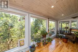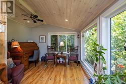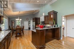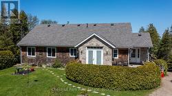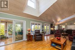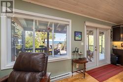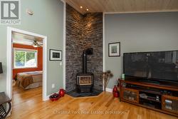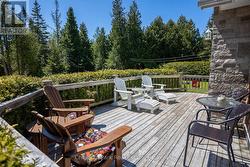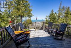 Peaceful Waterfront Living Near Tobermory. Welcome to this private, year-round 3-bedroom, 2-bathroom waterfront residence where comfort meets natural beauty. Perfectly positioned along a picturesque shoreline, the home captures stunning lake views from most rooms, while the expansive wraparound deck invites you to soak in colourful sunsets, enjoy morning coffee, or unwind beneath star-filled skies. Inside, the bright open-concept design showcases soaring vaulted wood ceilings, sun-filled dormer windows, warm maple hardwood floors, and a striking gas fireplace that anchors the inviting living space. The well-appointed kitchen offers granite countertops, stainless steel appliances, and rich cabinetry-ideal for both everyday living and entertaining. A separate four-season sunroom provides a quiet retreat for a home office, hobby space, or relaxing lounge. The primary bedroom features deck access, a spacious walk-in closet, and a beautifully finished marble-tiled ensuite. Practical highlights include main-floor laundry, central vacuum, full backup generator power, and a detached garage complete with water hookup. Mature perennial gardens surround the home, creating a serene and private setting, all just minutes from the shops, restaurants, and harbour of the charming village of Tobermory. (id:27)