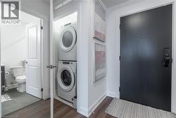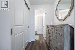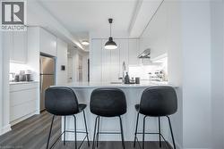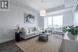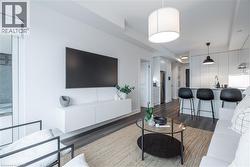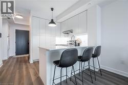 Unlock turn-key living at the Upper West Side Condos by Branthaven! This beautifully maintained 695 sq ft one-bedroom + den, one-bathroom suite on the fourth floor is truly one of a kind. Step inside to wide-plank flooring throughout, bright white walls in flawless condition, and a stunning kitchen featuring quartz countertops, subway tile backsplash, under-cabinet lighting, undermount sink, floor-to-ceiling cabinetry, seating for three at the peninsula, a dedicated coffee bar, and a fridge water line hook-up. The spacious living room boasts soaring ceilings, a builder-upgraded TV-ready package, and access to a private 50 sq ft south-facing balcony with serene views. The bedroom easily accommodates a queen bed with room to size up and offers an expansive closet with room for a dresser, plus a valued builder upgrade: ensuite access to the four-piece bathroom, complete with a large vanity, ample counter space, and pristine tilework. Additional highlights include in-suite laundry, an entry closet, geo-thermal heating and cooling, one storage locker, one underground parking space, and Bell internet included in the condo fees. Enjoy the convenience of keyless entry and the BH Home Technology system for a seamless living experience. Residents have access to top-tier amenities, including a concierge and security, fully equipped gym, pet wash and grooming station, media and party rooms, games rooms, rooftop deck and garden with BBQs, and ample visitor parking. Located in the heart of Joshua Meadows, you’re just a short drive to the Uptown Core for shopping, dining, and services, as well as nearby walking trails, golf, parks, and top-ranked schools. Commuting is effortless with quick access to highways 403, 407, and the QEW, making both work and play incredibly convenient. (id:27)
