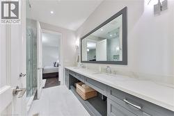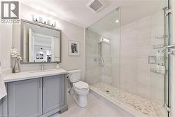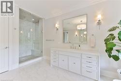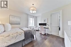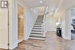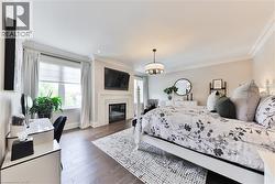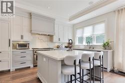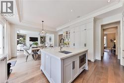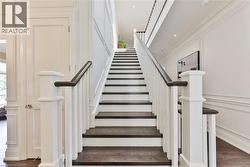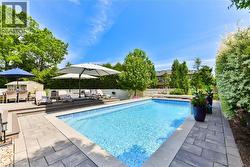 Every so often, a home comes along that sets a new benchmark. This custom-built residence combines timeless architecture, magazine-worthy interiors, and a resort-style backyard with over 6,100 sq. ft. of finished living space. Set on one of the largest pie-shaped lots in the neighbourhood (over 45% larger than average) and just 3km to Appleby College, it offers a rare sense of scale and privacy. Southwest-facing gardens showcase a heated saltwater pool, tiered lounging areas, ambient lighting, and mature hedging. Inside, 10’ ceilings, wide-plank hardwood, and bespoke millwork create quiet sophistication. The open-concept kitchen and family room with gas fireplace and French doors connect seamlessly to the gardens. A formal living room, elegant dining area, and private office complete the main floor. Upstairs, the primary suite rivals a luxury hotel with spa-inspired ensuite and dressing room, complemented by 3 bedrooms and laundry. The finished lower level adds a rec room with wet bar, gym, sauna, bedroom, and bathroom, ideal for teens, guests, or multigenerational families. (id:27)