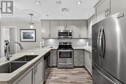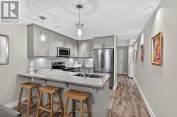 Luxury, location & carefree living converge in this exceptional showpiece at the coveted 'Windermere Manor'. This boutique, Art Deco-inspired building is truly remarkable, offering timeless elegance, modern sophistication & an exclusive lifestyle with only 33 residences. This stunning 2-bedroom, 2-bathroom luxury suite, 'Thornton' model, spans 1,205 square feet of designed living space, ideal for both entertaining & everyday comfort. The chic open-concept layout features floor-to-ceiling windows, pot lights, custom blinds, designer lighting & ample storage, creating a bright & refined atmosphere. A welcoming foyer leads to the well-appointed kitchen with granite countertops, stylish backsplash, under-cabinet lighting, stainless steel appliances, pull-out cabinetry & a breakfast bar with pendant lighting. The dining area overlooks the living room, highlighted by a tray ceiling & expansive window. The spacious primary suite offers a walk-in closet & a spa-inspired four-piece ensuite with walk-in shower. Split bedrooms ensure privacy, while the second bedroom features a floor-to-ceiling window & generous closet. A three-piece bath, utility room & large in-suite laundry/storage room complete the suite. One owned underground parking space is included. A rare highlight is the private, oversized rooftop terrace for exclusive use-perfect for outdoor relaxation & entertaining, while also providing additional storage capacity. Enjoy access to the Windermere Club, a rooftop retreat with full kitchen & bar, billiards, fitness centre, sauna, BBQs & indoor/outdoor lounges. Includes a grand lobby, library, conference room, bike storage & visitor parking. Ideally located within walking distance to Lake Ontario, downtown Oakville, trails, parks, cafés, restaurants, shopping & amenities, with easy access to the GO Train & major highways. An exceptional offering of space, quality & luxury-this home truly has it all. VIEW THE 3D IGUIDE VIRTUAL TOUR FOR MORE PHOTOS, FLOOR PLAN & VIDEO (id:7525)