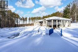 25 ACRE QUALITY-BUILT ESTATE WITH OVER 4,600 SQ FT, WALKOUT BASEMENT, TRIPLE GARAGE & EXTENSIVE OUTDOOR LIVING! Set on 25 acres with forest, gardens, a pond with a deck, and a flowing stream, this custom-built brick bungalow feels like the place you didn't know you were searching for. Private trails stretch across the property for walking, biking, snowshoeing, and cross-country skiing, while outdoor adventure continues nearby with access to golf courses, snowmobile trails, boat launches, beaches, Horseshoe Valley, Vetta Nordic Spa, and Bass Lake Provincial Park. Outdoor living takes centre stage with two large covered porches, a sun-filled entertaining deck, a fire pit, and multiple open spaces designed for use and enjoyment year-round, complemented by a triple-car garage and an oversized driveway offering generous room for vehicles and toys. Built with quality craftsmanship, strong energy efficiency, and clear pride of ownership, the home offers over 4,600 sq ft of finished living space across a thoughtful layout. A dramatic wall of windows anchors the living room with pond and garden views, flowing into a formal dining room and a bright family room with a covered porch walkout. The kitchen includes quartz countertops, pantry storage, stainless steel appliances, and a walkout to the deck, while a separate den provides flexible space for a home office, studio, or media room. When it's time to unwind, the primary suite offers a walk-in closet and private 3-piece ensuite, with two additional bedrooms served by a 4-piece main bath. The walkout lower level with in-law potential adds a 4th bedroom, a den with patio access, a spacious recreation room with a wood stove, workshop and gym areas, a 3-piece bath, and cold storage. Additional highlights include a hot tub, pool table, owned water heater, water purification system, shingles updated in 2014, and enhanced attic insulation. This is the kind of #HomeToStay that changes what you think you're looking for. (id:27)