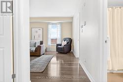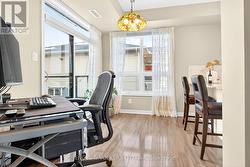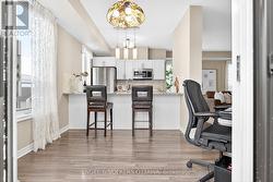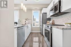 Located in the heart of Chapman Mills, this bright and thoughtfully designed Bravo model 2-bed, 2-bath condo spans approximately 1,038 sq. ft. and features a large walkout terrace. The main living area is warm and inviting, with a seamless flow between the dining, kitchen, and living spaces. Oversized windows fill the rooms with natural light, while the updated kitchen features white shaker cabinetry, granite countertops, stainless-steel appliances, and a peninsula with seating that opens into the dining area with direct access to the terrace. With wood-plank flooring and a clear glass railing, this unit's outdoor space is perfect for morning coffee, unwinding with a book, or enjoying views of the surrounding neighbourhood while dining. The primary bedroom, with a tray ceiling detail and plush carpeting, features ample closet space and leads to an ensuite with a walk-in shower. The well-proportioned secondary bedroom features a large picture window and mirrored closet doors, making it ideal as a children's or guest room. A second full bathroom, located near the unit's entrance, features tiled flooring and a tub/shower combo. Just off the main lobby, access to the garage space and a storage locker make unpacking the car a breeze! With everyday amenities just minutes away, including shopping, grocery stores, restaurants, public transit, and cafés, this home is ideal for both downsizers and young professionals in one of Barrhaven's most desirable neighbourhoods! (id:27)