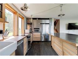 UNINTERRUPTED WATER VIEWS AWAIT YOU! Nestled atop one of the highest points in Puslinch and just minutes from the charming Campbellville equestrian community, this unique opportunity invites you to either build your dream home (initial drawings and survey available) or reimagine the existing structure on a generous 1-acre lot (225 x 194 feet). Experience a beautiful nature sanctuary with stunning views of Mountsberg Reservoir, which spans 472 acres outside your door. Each morning, wake up to vibrant sunrises illuminating your backyard. The recently constructed garage measures 24x28 ft and is fully insulated, featuring three layers of high-density foam beneath engineered wood siding. It is framed with sturdy 2x6 lumber, topped with a durable steel roof, and equipped with a 100 Amp electrical panel and an EV charger. With buried water and sewer lines running to the garage foundation, the upper level can easily be transformed into a workshop or studio apartment, enhancing the investment! This incredible setting isn’t just a building lot; it’s also the perfect starter home for those dreaming of a country lifestyle that could become your family retreat. Currently, the property boasts a loft bungalow with an abundance of windows, a spacious great room, a luxurious kitchen ready for culinary adventures, and sleeping quarters with both a main floor bedroom and a whimsical loft bedroom. There’s also a wood stove, heat pumps, and AC. You'll also love the charming cordwood garden shed. Conveniently located close to Highway 401, commuting to Guelph, Burlington, Hamilton, and the GTA is easy. Experiences awaits nearby, including a boat launch where you can fish or paddle in your kayak or non-motorized boats. Additionally, you'll discover a variety of beautiful hiking trails and excellent fishing opportunities in the area, all surrounded by breathtaking scenery. Start planning your visit and be first in line for your new lifestyle and investment today!