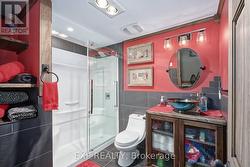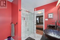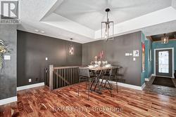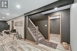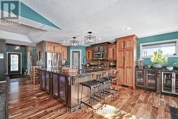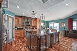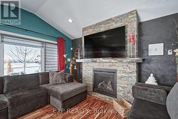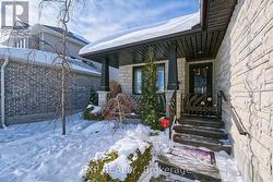 This stunning bungalow in sought after Shaw Valley is sure to impress. The curb appeal is exceptional featuring a beautiful stone exterior, custom wrought iron railings, professional landscaping and a concrete laneway with parking for 4. The heated double car garage has basement access into the home. The entrance has slate Versailles tile and wonderful sightlines through the home. The main level offers a well placed guest bedroom, custom full bathroom and a laundry with direct access to the garage. The bright open concept living area at the rear has amazing vistas of the backyard and greenspace and is anchored by a cozy fireplace perfect for daily living and entertaining. Enjoy a perfectly sized dining area plus a spacious kitchen with rich cherry cabinetry, stainless steel appliances, an over sized island and a corner pantry. Striking titanium black granite with dramatic black, gold, white veining and live edge finish is on the kitchen island, counters and fireplace mantle for a cohesive high end look. The luxurious finishes continue with walnut flooring, slate backsplash in the kitchen and on the fireplace, black hardware, island corbels and interior cabinet lighting. The breakfast nook includes a built in serving hutch with a bar fridge and patio access. More Upscale finishes include a curated lighting package including an Artika chandalier, Eglo Conrad fixtures, lovely pendant lighting all complemented by pot lights. Main level primary bedroom offers a peaceful retreat with tray ceilings, a walk in closet and exquisite private ensuite and bathrooms have gorgeous ceramic tile and Novatto Godere sinks. On lower level find a second fireplace on a custom feature wall, a third BDR and den/4th BDR all with large egress and custom window framing, and a tasteful 3pc bath with heat lamps. Amazing entertainer's dream backyard. Canopied stamped concrete patio and cooking area, built in BBQ and shed. Only 13 minutes to Port Stanley beaches, 15 minutes to 401 (id:27)