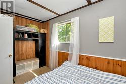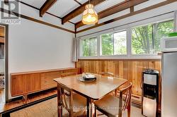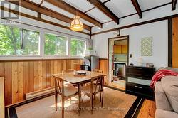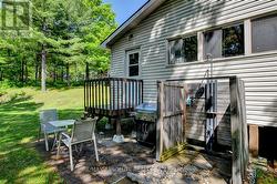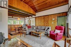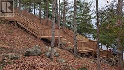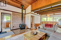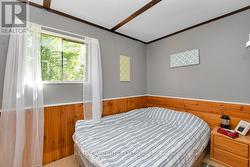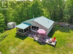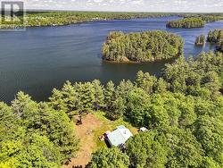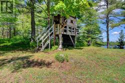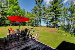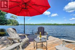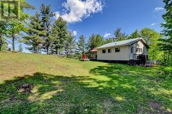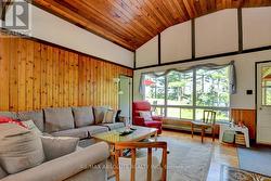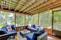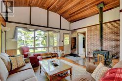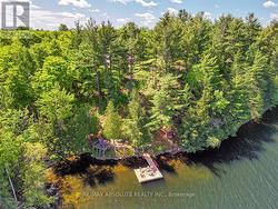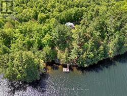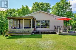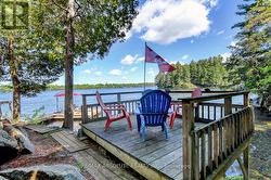 Rare opportunity to own 6.9 acres of waterfront with approximately 850 feet of shoreline and mature mixed forest offering exceptional privacy. This rustic three-season cottage features tongue and groove pine ceilings, a durable metal roof, and an open-concept living area with expansive lake-facing windows. Three bedrooms provide cozy accommodations, while a screened sunroom and spacious deck are ideal for outdoor entertaining. Set slightly elevated, a newer staircase leads down to the water and a large dock in a private bay, perfect for swimming and boating. Property offers excellent future potential to enjoy as-is, build, or explore severance possibilities (buyer to complete due diligence with township). Water source is lake intake. Annual road maintenance fee $134. 24-hour irrevocable on all offers. (id:27)