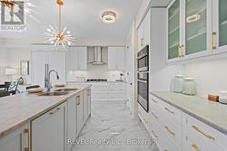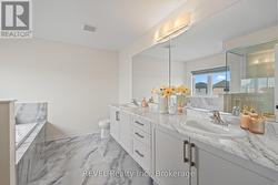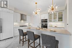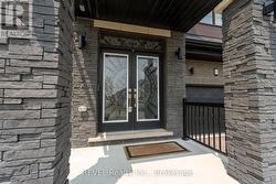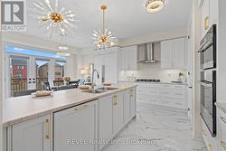 Modern Architectural Masterpiece Backing Onto Ravine Views: Perfectly positioned on a premium 50-ft ravine lot with stunning sunset views, this architecturally striking two-story home offers an exceptional blend of modern design, privacy, and elevated living. A bold exterior sets the tone, while inside, carefully selected finishes create a refined yet functional space. Double entry doors open to a bright main level with 9-ft ceilings, solid 8-ft interior doors, and oversized 24x24 porcelain tile. Engineered hardwood flows through the dining and living areas, highlighted by a sleek gas fireplace and expansive windows overlooking the ravine. Triple French doors lead to a spacious deck with gas BBQ hookup-ideal for entertaining or relaxing outdoors. The chef-inspired kitchen is a true statement, featuring custom cabinetry, soft-close drawers, glass accents, and elegant gold hardware, paired with premium built-in Dacor appliances including a 30-inch column fridge, 24-inch freezer, glass cooktop, and combination wall oven/microwave. Upstairs, an oak staircase with wrought-iron detailing leads to generous bedrooms. The primary suite offers a spa-like ensuite with double vanities, a freestanding soaker tub, and a frameless glass shower. Secondary bedrooms share a stylish Jack & Jill bathroom with floating vanities. The walkout basement provides excellent flexibility with oversized windows, triple French doors, laundry hookup, rough-in bath, and separate side entrance-ideal for an in-law suite, home office, or future income potential. Notable upgrades include Nest thermostat, motorized blinds, upgraded lighting, central vacuum, humidifier, air conditioning, mudroom with garage access, walk-in pantry, garage door opener, and EV charger rough-in. A sophisticated home designed for those who expect more. (id:27)