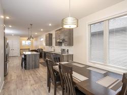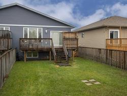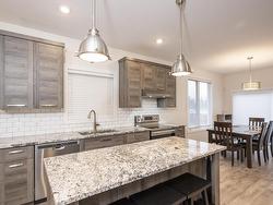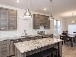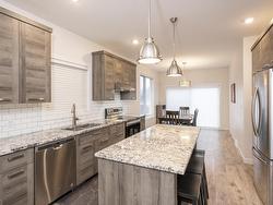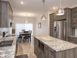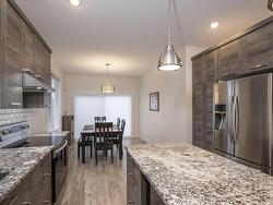 This 2017 open concept 1+2 bedroom bi-level + 3 bathrooms. Attached garage all granite + stainless kitchen with island + dining room onto patio doors to deck with fenced yard, all bathrooms granite top vanity... luxury finished throughout. Primary bedroom with walk-in closet + ensuite, air conditioning high ceilings in lower level. Rec room could put a 4th bedroom. Great location, close to shopping + parks, schools...