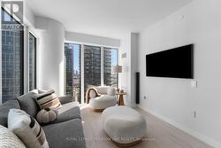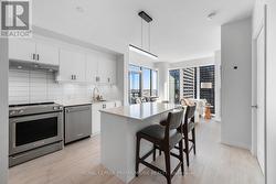 Welcome to Charisma West Tower! This stunning 2 bedroom, 2-bathroom corner suite with parking and locker offers 875 sq. ft. of interior living space plus a 200 sq. ft. wraparound balcony with bright south-east exposure. Featuring a highly sought-after split bedroom layout, soaring 9 ft. ceilings, premium flooring, and countless upgrades, this unit has it all. The sleek modern kitchen boasts a centre island, quartz countertops, designer backsplash, upgraded moulding, and full-size stainless-steel appliances, while both bedrooms are outfitted with custom cabinetry closets. The spacious open-concept living and dining area is filled with natural light, creating a warm and inviting atmosphere. Residents enjoy access to exceptional building amenities including a 24-hour concierge, Wi-Fi lounge, and 7th floor wellness centre. Perfectly located steps from Vaughan Mills, TTC subway, VMC Bus Terminal, Viva Rapid Transit, Hwy 400/407, Cortellucci Vaughan Hospital, and Canada's Wonderland, this bright and beautifully upgraded unit is a must-see in a high-demand community! (id:27)