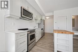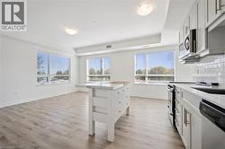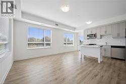 Largest 1 bedroom layout within the building. Stylish 1-bedroom, 1-bathroom corner unit at Blackstone Condos. The residence exudes modern sophistication with high-end upgrades throughout. Noteworthy features include extra windows in the corner unit that flood the space with natural light, a meticulously upgraded kitchen with quartz countertops, top-tier cabinetry, custom island, and premium hardware. The bedroom offers a sizable closet, while the inclusion of in-suite laundry and underground parking adds to the convenience of daily living. The Blackstone Condos offer a plethora of amenities that cater to a lifestyle focused on outdoor recreation, health, and relaxation. Residents can take advantage of the fitness center, outdoor kitchen, firepit, dog wash facilities, rooftop terrace, heated underground parking, and various other upscale offerings. Whether for first-time homebuyers, investors, or individuals seeking to downsize, this property presents an ideal opportunity. Noteworthy for its accessibility, the elevator's strategic placement near the main entrance, unit main door, and underground parking space ensures ease of mobility — no walking down long hallways. Additionally, the Blackstone Condos enjoy proximity to Conestoga Mall, St. Jacobs Market, and LRT transit, embodying urban living at its finest. (id:27)