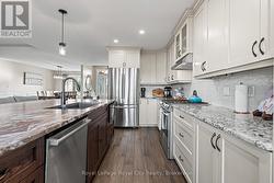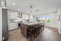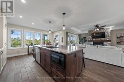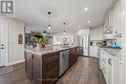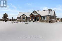 Rustic Lodge Charm Meets Modern Living. Welcome to this striking custom-built bungalow, set on a picturesque 1.15-acre lot in the sought-after Marshall Heights subdivision, where peaceful country living blends seamlessly with a welcoming sense of community. Timber beams frame the inviting front porch and lead into a spacious foyer, setting the tone for a home designed for both everyday comfort and effortless entertaining. The great room is the heart of the home, anchored by a spectacular stone fireplace that creates the perfect backdrop for cozy evenings and memorable gatherings. The chef-inspired kitchen is a true showpiece, featuring an oversized island, beautifully crafted cabinetry and thoughtful details that make everything from casual breakfasts to holiday hosting a joy. Entertain with ease in the formal dining room or take the celebration outdoors to the expansive deck, complete with a partially covered area ideal for dining, relaxing, or watching sporting events. The private primary suite is tucked into its own wing offering a walk-in closet, spa-like ensuite and direct access to the deck. Two additional bedrooms and a full bath are thoughtfully placed in the opposite wing, providing comfort and privacy for family or guests. Practicality meets style with a powder room, main-floor laundry, and an oversized double garage with inside entry. The fully finished lower level expands your living space with three more generous bedrooms, a family room, full bathroom, ample storage and a cold cellar. Outside, the expansive beautifully landscaped yard offers endless possibilities. A large shed, RV/boat parking and plenty of room for a pool or future workshop make it ideal for hobbyists and outdoor enthusiasts alike. Perfectly located between Durham and Mount Forest, you'll enjoy easy access to year-round recreation including hiking, ATVing, skiing, and snowmobiling, all just minutes away. This is more than a home, iIt's the lifestyle you've been dreaming of. (id:27)