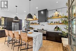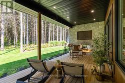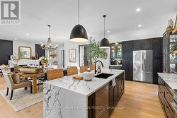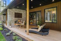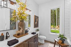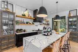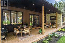 Welcome to 107 Louise Creek Crescent, a stunning 5-bedroom plus den, 5-bathroom bungalow perfectly situated on a quiet, tree-lined street in Elmwood. This custom residence showcases a captivating wood and Shouldice designer stone exterior, blending timeless elegance with modern design. Inside, you'll find wide plank hardwood floors, soaring 10 ft ceilings on the main level, and 8 ft doors that create a sense of space and luxury throughout. The open-concept kitchen, living, and dining area is ideal for both everyday living and entertaining, featuring top-of-the-line appliances and abundant natural light. Step outside to your own private treed oasis, where a covered back porch with a stone wall and double-sided fireplace creates the ultimate atmosphere for year-round enjoyment. The spacious primary suite offers a luxurious ensuite retreat complete with heated floors, while all additional bedrooms are generously sized to accommodate the whole family. An oversized heated 3-car garage with direct stairs to the lower level adds unmatched convenience and functionality. Conveniently located steps from Boyd Lake and scenic walking trails, with school bus route access, this home is the perfect blend of comfort, style, and practicality. (id:27)
