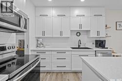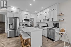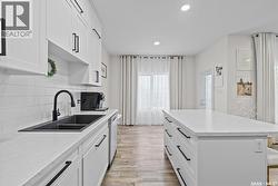 A premier West Hill showstopper! Move in and do absolutely nothing to this stately 1,764 sqft residence offering 3 bedrooms and 3 bathrooms, a walk-out basement, heated 20’ x 26’ attached garage, and panoramic views of Prince Albert’s northern skyline. The main level showcases a timeless white custom kitchen complete with a stylish subway tile backsplash, stainless steel appliances, and an oversized walk-in pantry perfect for both everyday living and entertaining. The upper level features all three bedrooms along with a spacious and convenient laundry area. The fully developed lower level includes a large recreation/family room ideal for a home office, day home, or gathering space, abundant storage, and walk-out access to a fully fenced, beautifully landscaped yard with a ground-level patio. A rare combination of location, layout, and finish this home truly stands out. (id:27)