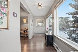 Welcome to Spruce Grove Manor, a well-established and highly regarded 55+ building located in the desirable University Heights neighborhood on Saskatoon’s east side. This spacious unit offers approximately 1,300 sq. ft. of comfortable living space, featuring two bedrooms and 1.5 bathrooms. The layout includes a large primary bedroom with private 2-piece ensuite, a second bedroom, a full 4-piece main bathroom, and a generous combined laundry and storage room with additional built-in cabinetry. The kitchen is well-appointed with oak cabinetry, upgraded countertops, tile backsplash, stainless steel range, built-in dishwasher, refrigerator, and white range hood with shelf microwave. A spacious dining area sits directly off the kitchen, flowing into a large living room that easily accommodates multiple furniture arrangements. An enclosed sunroom with expansive windows provides abundant natural light and enjoyable outdoor views year-round. Additional upgrades include laminate flooring throughout the main hallway, dining room, living room, and sunroom, wall-mounted air conditioners, custom blinds, and extra storage. The unit includes one underground parking stall and a separate basement storage locker. Residents also enjoy access to a large amenities room for gatherings and meetings, as well as a shared workshop area. Conveniently located close to shopping, parks, and major roadways, this is an ideal opportunity for those looking to downsize without sacrificing space or comfort. (id:27)
