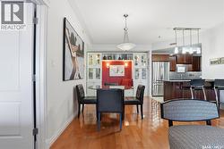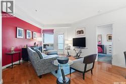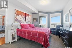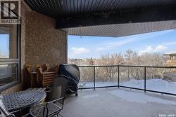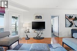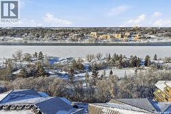 Perched along one of Saskatoon’s most prestigious riverfront addresses on Saskatchewan Crescent West, this 1,079 sq ft executive condo offers a refined blend of calm, privacy, and uninterrupted views across the Meewasin Valley and South Saskatchewan River. Lovingly maintained by the original owner and lightly lived in (approximately four months per year), this home presents in mint condition, with timeless finishes that feel both elevated and enduring. Hardwood flooring and cabinetry, classic tile and grout, and custom built-in seating create a living space designed to be enjoyed fully and relaxed. The kitchen features stainless steel appliances and a thoughtful, functional layout with a large eat-up island that blends seamlessly into the open living and dining areas, ideal for quiet mornings or relaxed evenings at home. Two bedrooms and two bathrooms offer flexibility and comfort, including a river-facing primary suite with a walk-in closet and glass-enclosed walk-in shower. The second bedroom includes a beautiful custom Majestic-built Murphy bed and sits adjacent to a full 4-piece bathroom, making it equally suited to hosting guests or working from home. Central air conditioning, central vacuum, a retractable porch screen door, and underground parking add everyday ease, while the quiet, well-managed building offers premium amenities including a guest suite, amenities room, and exercise room. A refined riverfront lifestyle on where walkability, views, and understated luxury come together, this unit is sure to leave you feeling impressed. Located near nature, bus routes, downtown amenities, and the services on 8th St, you will love the accessibility and flexibility this home offers. Call your Realtor for your own exclusive tour now! (id:27)