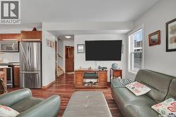 Welcome to Douglas Point, a sophisticated Evergreen townhouses community with mature developments to allow for peaceful enjoyment. Arguably the best home boasting an end unit, extended driveway, expansive yard space on the one side, and backing up to the park walking path, enclosed with sharp black metal fencing. The home itself has trendy maple hardwood flooring, walnut doors/trim, porcelain tile, and well-maintained carpet. The kitchen has beautiful New York style cabinetry, stainless steel railings, soft close hardware, quartz counters, white glass backsplash, and designer stainless steel undermount sinks. You will experience abundant natural light with the added windows in the living room; currently housing blackout remote control window covers with a backup set of medium shade remote control window covers in the basement storage. The upstairs provides comfort in three bedrooms including one oversized master with walk-in closet, and a cheater door directly to the 4pc bathroom. The basement has an industrialized design with epoxy flooring throughout, an oversized tile shower, extra storage, a family space for rumpus or hobbies, and spray foam to ensure maximum comfort. Additional upgrades features include a natural gas BBQ hookup, humidifier, new paint (2023), new washer (2024), and an extra exterior water tap. Book your showing for the cream of the crop! (id:27)