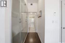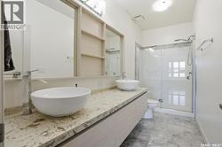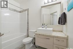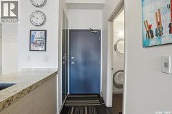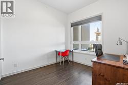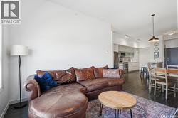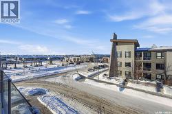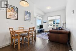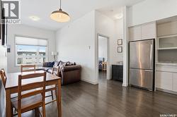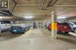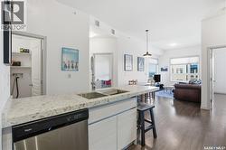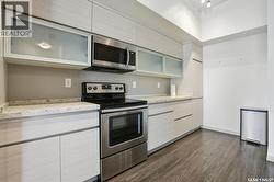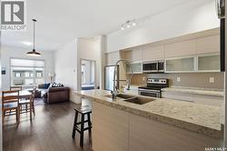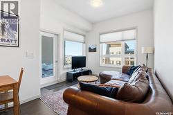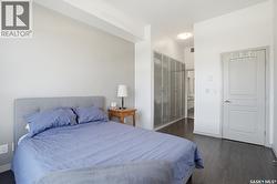 Spectacular top-floor condo in Sequoia Square! This impressive 2-bedroom, 2-bathroom residence features 10-foot ceilings and oversized windows that flood the space with natural light. The open-concept floor plan is beautifully finished and includes in-floor heating throughout for year-round comfort. The kitchen is designed to impress with quartz countertops, soft-close cabinetry, stainless steel appliances, and seamless flow into the dining and living areas. The primary bedroom is a true retreat, offering large windows, a sophisticated dressing/closet area, and a modern en-suite with double sinks, heated tile flooring, and a walk-in shower. A second bedroom, four-piece bathroom, and convenient laundry/storage room complete the interior. Additional highlights include a spacious balcony, central air conditioning, one underground parking stall with storage cage, and one electrified surface parking stall. Both parking spots are close to doors and elevator. The building offers a welcoming main lobby and recreational rooms on each floor. Ideally located with easy access to the University of Saskatchewan and surrounding amenities. (id:27)