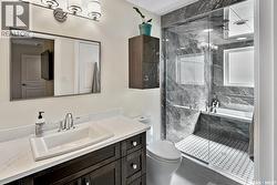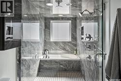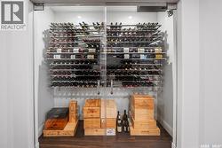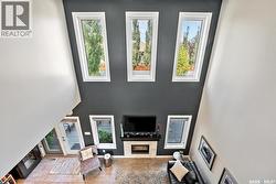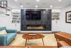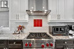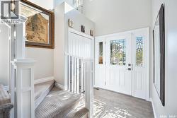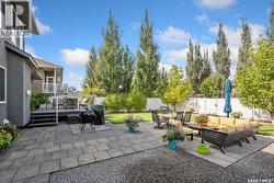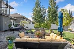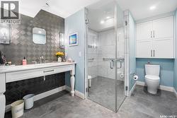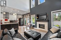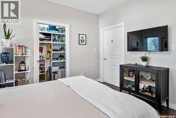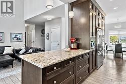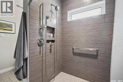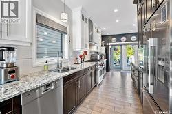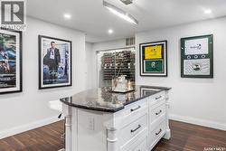 Immaculate custom-built home in Warman with Premium finishings designed with wheelchair accessibility in mind. Main Floor: Extra-wide galley kitchen with granite counters, high-end appliances (gas stove/hood fan, double-door fridge/freezer, built-in microwave, dishwasher). Main-floor primary bedroom with walk-in closet and direct access to 3-pc accessible bath. Wide hallways, lever handles, roll-under sinks. Personal 3-stop elevator with access to garage, main, and basement. Second Floor: Second primary bedroom plus bedroom/office. Shared 4-pc bath (reno 2022) with access from both rooms. Basement: Exceptional entertainment space featuring a large family/media room with fireplace, custom shelving, and 10-speaker Dolby Atmos system. High-end wet bar with granite island, dual-drawer dishwasher, drying-rack sink, custom cabinets, and glass wine cellar (300 bottles). Bedroom with built-in queen Murphy bed next to 3-pc bath. Laundry, storage, and utility rooms. Garage: Fully insulated and heated double garage with EV charger and full golf simulator (projector, retractable screen/enclosure). Elevator access. Yard: Low-maintenance landscaping with composite deck, 4-hole putting green, artificial chipping area, extensive patio with multiple seating/BBQ areas, vinyl fencing, large garden boxes with underground sprinklers, and four storage sheds. Accessibility Highlights: Two roll-in showers with grab bars and multi-head fixtures, full turning radius bathrooms, wide hallways/kitchen, extra-wide fence gates, moveable rubber ramp, main-floor bedroom sized for lift use. Updates: Hot water tank (2019), upstairs bath (2022). A must see for any family! (id:27)