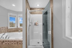 . Beautifully upgraded two-storey front garage home in the heart of Coventry Hills, offering the perfect blend of style, comfort, and practicality. The main floor features 9-foot knockdown ceilings, rich hardwood flooring, and a welcoming entry with a front closet and decorative niche. The open-concept layout flows seamlessly through a bright living area with two large windows, a cozy natural gas fireplace in the dining area with built-in shelving, and a stylish kitchen complete with maple cabinetry, granite countertops, stainless steel appliances including a double-door fridge with water line, a pantry, and a sunny south-facing window. A convenient half-bath and a separate laundry room with upgraded washer and dryer complete the main level. Upstairs, the elegant railing with metal spindles leads to a spacious bonus room with vaulted ceilings, pot lights, and large windows—an ideal space for family relaxation. The primary bedroom offers a generous layout with a walk-in closet and a luxurious ensuite featuring double sinks, a jetted tub, a standing shower, tile flooring, and pot lighting. Two additional bedrooms upstairs are bright and roomy, complemented by a full main bathroom. The finished basement expands the living space with a large recreation area and an extra bedroom—perfect for guests, teens, or a home office. The large south-facing backyard features a maintenance-free deck with glass railing and convenient back-alley access, making it perfect for RV parking without sacrificing yard space. Ideally located within walking distance to several elementary schools, a public middle school, parks, and green spaces—plus just minutes to Notre Dame High School, Vivo Rec Centre, Country Hills Town Centre, and Coventry Hills Centre for all your shopping and dining needs. Enjoy easy access to Stoney Trail, public transportation, and the airport—making this upgraded, move-in-ready home the perfect combination of comfort, convenience, and community living.