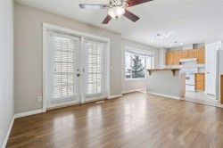 Come check out this bright & sunny 3 bedroom up townhome that backs onto the picturesque Nose Creek greenbelt system! With ample space to spread out and grow this home is perfect for the growing family. Featuring 3 oversized upper floor bedrooms, spacious ensuite with soaker tub, laminate flooring, vaulted ceilings, oversized windows, garden doors and a full double car garage. Relax and stay warm during the long cold winter nights with the cozy main floor fireplace while entertaining for friends and family. Enjoy the privacy on the back deck with no neighbours behind and Love the amazing views that you'll get to wake up to everyday. Long walks along Nose Creek trail, visiting ponds, playgrounds and the creek system are just some of the hidden elements of nature that Hanson Ranch has to offer as one of the most scenic and tranquil neighbourhoods you'll find in NW Calgary. Always family friendly and easy to get around make this a true gem of a neighbourhood that few get to call home. Shops and convenience are just steps down the hill. The unfinished lower level gives you options to grow or for extra storage. Access to Stoney and Deerfoot is quick and easy to get you downtown or to the airport. This home is ready for your personal touches and move in ready!