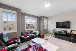 Welcome to this beautifully finished family home in sought-after Sage Hill. Step into a spacious foyer with a full closet, then into a bright living room centered around a cozy gas fireplace. The adjoining dining area opens through to an east-facing backyard—perfect for sunny morning coffee—complete with a deck and patio for effortless entertaining. The gourmet kitchen impresses with granite countertops, stainless steel appliances, a gas range, and ample storage. A functional mud room with sink and main-floor laundry, plus a convenient 2-piece bath, complete this level.Upstairs, a generous bonus room offers flexible space for movie nights or a home office. Three bedrooms include a serene primary retreat with a walk-in closet and a luxurious 5-piece ensuite featuring dual sinks, an oversized shower, and a corner jetted tub. A well-appointed 4-piece main bath serves the additional bedrooms.The professionally developed lower level extends your living space with a comfortable recreation room, a fourth bedroom, and another full 4-piece bathroom—ideal for guests or teens. Outside, enjoy a fully landscaped, extra-deep 142' lot with no direct rear neighbors, providing privacy and room to play.Notable upgrades include 9' knockdown ceilings, rich hardwood flooring, a newer A/C unit, high-efficiency furnace, large hot water tank, and a finished garage. With quick access to schools, parks, pathways, transit, and all the shops and dining of Sage Hill, this is the complete package—stylish, functional, and move-in ready.