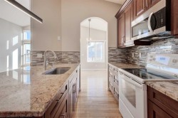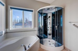Welcome to this Bright and Spacious bungalow (1,337 sf) with total 4 bedrooms 2.5 baths in desirable West Springs SW, situated on a rare oversized pie lot over 600 sq. meters. Open-concept main floor features vaulted ceilings up to 13 ft, expansive windows, and abundant natural light throughout the kitchen, dining, and living areas.Main level includes two bedrooms, highlighted by a large vaulted primary suite with a luxury ensuite featuring a soaker tub and steam shower with multi-jets. Convenient main-floor laundry and 2-piece bath. Fully developed lower level offers two large bedrooms, a full bathroom, and spacious (over 400 sf) family/recreation room.Outside boasts a huge private lot with mature and fruit trees, no-maintenance vinyl fencing, gated back lane access with RV parking supported by paving stones, and a front-drive attached double garage, total 6 parking spaces. Walking distance to Calgary French & International School, parks, schools, and nearby amenities. Ideal for families and downsizers.