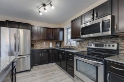 Updated family home on a quiet street featuring a large, private pie-shaped lot in the desirable NW community of Hidden Valley. Known for its abundance of green space, scenic pathways, and strong sense of community, Hidden Valley offers excellent access to Nose Hill Park, playgrounds, off-leash areas, and extensive walking and biking paths—ideal for active families. The home is conveniently located close to schools, public transit, and several nearby shopping districts including Beacon Hill, Country Hills Village, and Creekside, with quick access to Stoney Trail and Deerfoot Trail for an easy commute.This well-maintained home offers over 1,450 sq ft of developed living space, including 3 bedrooms and 2.5 bathrooms, perfectly suited for growing families. The main floor welcomes you with a spacious entryway, convenient main-floor laundry, and an open-concept kitchen, dining, and living area designed for everyday living and entertaining. Large windows provide excellent natural light and views of the expansive backyard.Upstairs, the primary bedroom includes a full ensuite, while two additional generously sized bedrooms and a full bathroom complete the upper level. The partially finished basement offers flexible living space and a bathroom rough-in, providing an excellent opportunity to customize and add value.Significant updates include air conditioning, furnace, hot water tank, humidifier, removal of poly-b pipes, new windows and blinds, flooring, dishwasher, and toilets, offering peace of mind for future owners. Outside, enjoy the beautifully landscaped yard complete with irrigation, a massive deck, and plenty of room for kids to play or to host family and friends. The double attached front garage adds everyday convenience and additional storage.A fantastic opportunity to own a move-in-ready home on an oversized lot in one of Calgary’s most family-friendly NW communities. Be sure to check out the virtual tour!