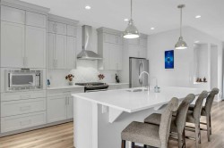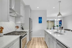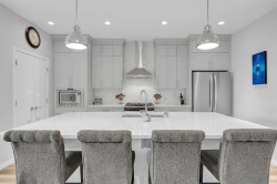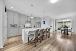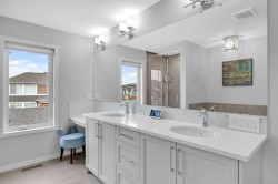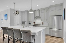 This executive paired home in Mahogany offers 1,888 sq. ft. of living space, a double detached garage, and incredible lake views.The main floor is bright and inviting, featuring oversized triple-pane windows, 9 ft. ceilings, and luxury vinyl plank flooring throughout. The stunning kitchen sits at the heart of the home and showcases extended Pewter cabinetry with soft-close doors and drawers, stainless steel appliances (including a built-in microwave and chimney hood fan), quartz countertops, and a large center island perfect for gathering with family and friends. A BBQ gas line adds convenience for outdoor entertaining.The living room takes full advantage of the lake views and includes a cozy gas fireplace, ideal for winter evenings. The spacious dining area easily accommodates a large table and provides access to the backyard patio through sliding doors. The home also features central air conditioning for year-round comfort.Upstairs you’ll find two bedrooms and a convenient laundry room complete with a front-load washer and dryer. The owner’s suite is a bright and relaxing retreat featuring a massive walk-in closet and a spa-inspired 5-piece ensuite with a soaker tub, separate shower, and private water closet.Located in an amazing estate area, just steps from the lake and beach, this home perfectly combines luxury, comfort, and the beauty of Mahogany’s lakefront lifestyle.