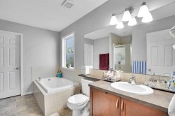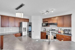 Awesome location! This bright and spacious 2-storey home is situated on a quiet street and has been newly painted with brand new laminate flooring throughout. The main floor offers a large open-concept kitchen featuring newer stainless steel appliances, new lighting, ample cabinetry, and a huge corner walk-through pantry leading to a generous laundry/mudroom with direct access to the double attached garage. The dining area overlooks the family room and is complemented by a study/office and a convenient powder room, making this level both functional and inviting. Upstairs, you’ll find a massive bonus room with large windows and a cozy gas fireplace, perfect for relaxing on cold winter nights. The primary bedroom easily accommodates king-size furniture and includes a sitting area. The spa-like ensuite features a soaker tub, separate shower, and a spacious walk-in closet. Two additional good-sized bedrooms, a deep linen closet, and a full 4-piece bathroom complete the upper level. The fully finished basement offers two good-sized bedrooms, a recreation room, and a 3-piece bathroom, providing excellent space for extended family or guests.