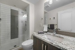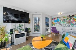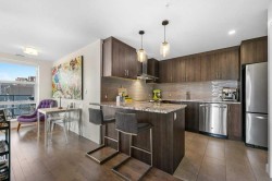 Welcome to a home where downtown living is redefined. Perfectly positioned in one of the Beltline's most coveted locations, this sophisticated corner unit offers a rare blend of city vibrancy and park-side tranquility. Built in 2015, this two-bedroom, two-bathroom residence showcases unobstructed city and stunning mountain views with a sun-drenched, southwest exposure that fills every room with natural light.Upon entry, you’re greeted by a sense of thoughtful design, from the generous storage to the secondary bath with its elegant, tiled shower and heated floors. The heart of this home is a beautifully appointed U-shaped kitchen, featuring full-sized GE stainless steel appliances, a sleek glass subway tile backsplash, and granite countertops. The oversized island offers ample seating, making it an ideal space for entertaining.The open living and dining areas are anchored by floor-to-ceiling windows and hardwood floors, creating a bright and expansive feel. A spacious primary bedroom is a true downtown rarity—easily accommodating a king-sized bed—and includes a custom-designed walk-in closet from California Closets to maximize storage. The primary ensuite is a private retreat, complete with a large soaker tub and heated floors.Enjoy warm summer days and breathtaking sunsets from your private west-facing patio, which overlooks Central Memorial Park and includes a gas line for your barbecue. The home is complete with in-suite laundry, A/C, titled parking, and two additional storage lockers.The Park elevates living with its exceptional amenities, including a massive common patio with a community garden, a guest suite, a well-equipped gym, and visitor parking with EV charging. This prime address puts you moments from both the tourism-worthy restaurants of 1 St SW and the vibrant culture of the Beltline and 4 St SW, offering a truly walkable lifestyle.