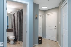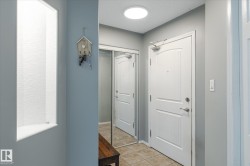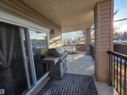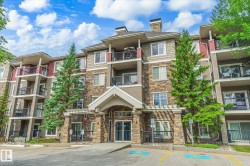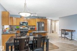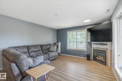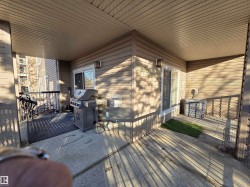 Beautiful main floor condo, open-concept 2-bedroom end unit offering 1216 square feet of living space. Newer vinyl plank flooring throughout. Bright and spacious living room has large windows, filling the space with natural light for a bright and sunny feel. Corner gas fireplace and south facing patio doors opening to a huge wrap-around deck, perfect for relaxing or entertaining. Island kitchen has ample cabinetry, generous counter space, and newer appliances. The large primary bedroom offers a walk-through closet and 4-piece ensuite. A second bedroom and oversized laundry room provide plenty of space for storage. Stay cool in the summer with newer central air conditioning. Newer paint as well. This unit includes two titled parking stalls—one underground and one surface. Building amenities include an exercise room and a social room/library. Located near shopping, dining, parks, and transit, with Century Park LRT just 8 minutes away. This condo is perfect for first-time buyers, downsizers, or investors!