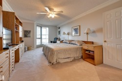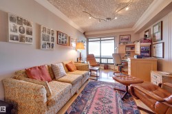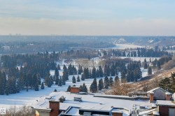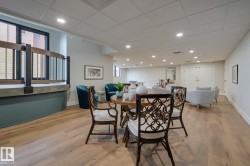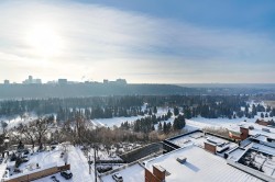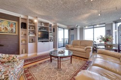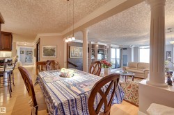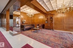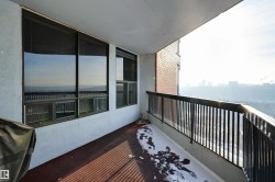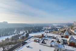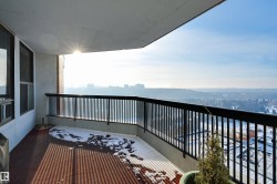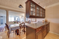 SPECTACULAR RIVER VALLEY VIEWS from this 1915 sq.ft. 2 bedroom + den, 2 bathroom condo in the sought after LEMARCHAND TOWER conveniently located close to the river valley trails, transportation & quick access to shopping, restaurants, coffee shops, the Brewery & Ice Districts. RENOVATED unit with a gourmet kitchen open to the living area featuring cherry wood cabinetry with plenty of pull out drawers offering lots of storage, a raised eating bar, granite countertops, built-in desk & a walk-in pantry. Formal dining room. The living area has a corner electric fireplace & built-in cabinets for the TV with pull out drawers. Double french doors to the den. The 2nd bedroom is across from the 4 piece bathroom. The spacious primary bedroom suite has a walk through closet to the 5 piece ensuite bathroom that has a jacuzzi tub & walk-in shower. Crown moulding throughout, hardwood flooring, carpeting in the bedrooms. 2 large U/G PARKING with storage over 1 stall. Guest suite, party room w a patio. Shows well