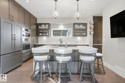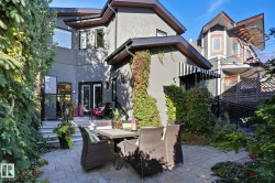 CUSTOM BUILT home with Legal 2-Bedroom Suite in the Heart of Garneau! Just ONE BLOCK from the University of Alberta, Whyte Avenue. Thoughtfully designed and meticulously finished, this home features Central A/C, Eco-Shield Argon windows, and an open-concept main floor filled with high-end custom finishes. showstopper kitchen with Bosch appliances, a waterfall quartz island and backsplash, and a walkthrough pantry with coffee bar. Upstairs, you'll find three bedrooms plus a vaulted den, including a luxurious primary suite with private second-floor balcony overlooking a beautiful, mature tree-lined street. The fully legal 2-bdrm BASEMENT SUITE features a PRIVATE ENTRANCE, its own laundry, and a full kitchen—ideal for rental income or multi-generational living. Additional highlights include a custom-built aluminum front porch, double detached garage, and a south-facing, professionally landscaped, low-maintenance yard.
