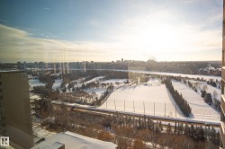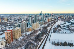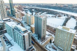 Welcome to the Gainsborough! A classy building situated in one of the most Iconic locations on Jasper Avenue. This 19th floor Unit has panoramic south facing views of the River Valley, and a direct line view down Jasper Ave. This unit is a sprawling 1249sqft, with a Cherry Wood Island kitchen, Quartz Countertops and beautiful Slate Tile Flooring. Two bedrooms plus a Den, Two full bathrooms, and automated window coverings. Underground heated stall, and a dedicated storage locker. Newer AC. The Gainsborough has gone through significant renovations over the years. Including an upgraded outdoor space with gas BBQ, A state of the art Modernized Gym. Incredibly beautiful Social Room and Guest Suite. The Condo fee includes heat and water! Enjoy the Restaurants and Cafes nearby, or Golf Victoria, this location is one of a kind and the building has been truly cared for.