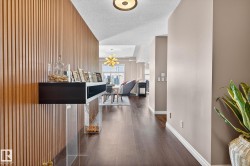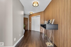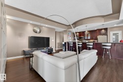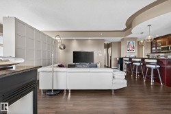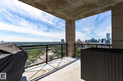 TRULY an AMAZING executive 1800 sqft PENTHOUSE, in the most striking looking building that offers a sophisticated design & the highest quality of craftsmanship. Located in the heart of downtown Edmonton within walking distance to all amenities including your favourite restaurants, shopping, the Art District & the walking trails of the River Valley. A Gated community! Arrive in the decorative paved courtyard surrounding a beautiful fountain leading to the grand entrance featuring a relaxing waterfall. Stunning open plan with 10 ft ceilings, numerous over sized windows, a huge chef's kitchen. Exotic African cherry engineered hardwood. All appliances including a wine cooler. Built-in vacuum, cozy gas fireplace, gorgeous ensuite, titled storage unit & two heated side by side underground parking stalls. New heat pump. Magnificent & unobstructed views of the lush River Valley, N Sask.River & city skyline as well as the romantic dazzling city lights at night. Huge private balcony. A definite Gem and a Must See!