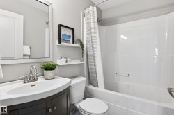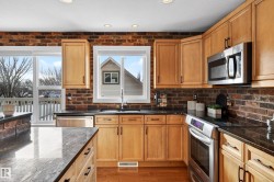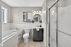 Beautiful 1622sqft, 4 bedroom PERRY-BUILT home sits on a charming tree-lined street in the heart of family-friendly community of Terwillegar Towne. Timeless character meets modern upgrades w/rich birch hardwood, solid maple cabinetry, granite countertops, ceramic tile, SS appliances, elegant wainscoting & central A/C. Open-concept main floor is perfect for entertaining, featuring a bright kitchen w/island that flows seamlessly into the living room, highlighted by a stunning gas fireplace with beautiful built-ins. Practical mudroom with storage leads to a massive rear deck overlooking the sunny southwest-facing backyard, beautifully landscaped w/stone patio. Upstairs offers 3 generously sized bedrooms, including a relaxing primary retreat complete w/jetted tub & WIC. Fully finished basement adds even more living space w/4th bdrm, family room, full bath w/heated floors, & ample storage. 24x24 heated garage w/finished loft, perfect as studio/gym/man cave. New (2yrs) roof on home/garage.