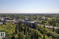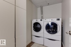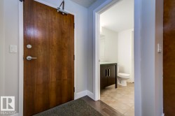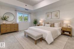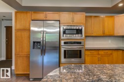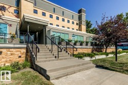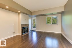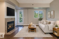 Welcome to Trinity Point, a concrete and steel building backing directly onto the Mill Creek Ravine. This two-bedroom home offers a large primary bedroom with walk-in closet and ensuite, plus a second bedroom that works well for guests, a home office, or creative space. The open layout features 9-foot ceilings, engineered hardwood, a gas fireplace, and central air conditioning. The kitchen is built for people who actually cook, with a gas cooktop, built-in oven, granite counters, and an oversized island. Step out to your private balcony overlooking the ravine, then head out: Whyte Ave, Downtown, Ritchie Market, and the River Valley are all minutes away. A second bathroom, oversized laundry room, storage room, underground parking, pet-friendly policies, and an on-site gym make day-to-day living easy. Solid construction, green space out back, city life out front.