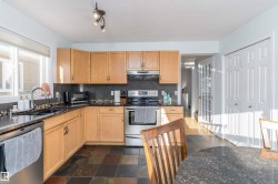 Step into this welcoming 1,417 sqft single-family home—ideal for first-time buyers or growing families. Offering 3 spacious bedrooms and 2.5 bathrooms, this home blends warmth and style with rich hardwood flooring and slate tile. The kitchen is the heart of the home, featuring granite countertops and a matching granite tabletop included with the property—perfect for everyday meals and entertaining. Upstairs, the primary suite includes a walk-in closet and 4-piece ensuite. Two additional generous bedrooms complete the upper level. The fully finished basement adds excellent extra living space with a rec room, dedicated office area, and plenty of storage. Recent upgrades include newer shingles, furnace, fridge, fence and gates, plus a welcoming deck. Enjoy a double car garage and a convenient location close to shopping and a nearby dog park.
