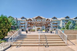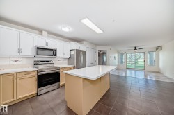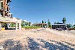 Welcome to The Lodge at Lewis Estates! This sought-after 30+ adult living complex feels like a mountain lodge retreat, complete with fitness centre, hot tub, steam room, party room, theatre, two rooftop patios, and a car wash — all just steps from the golf course. TIHIS UNIT FEATURES A RARE TITLED STORAGE UNIT! This main-floor condo offers 2 bedrooms and 2 bathrooms with a bright, open floor plan. The chef-inspired kitchen features Decorastone resurfaced granite countertops, abundant cabinetry, and a large island. The spacious bedrooms are separated by the living room, which opens to a west-facing covered patio with park views — the ideal spot to enjoy warm summer evenings. Highlights include a 3-pc main bath, 4-pc ensuite, in-floor heating, in-suite laundry, and storage. Complete with A titled parking stall very close to the elevators. Cats, birds & fish permitted with board approval (sorry, no dogs). Conveniently located near Transit, shopping, WEM, and with easy access to the Anthony Henday.
