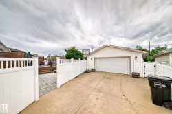 Welcome to this warm 3 bed, 3 bath home, perfect for families or those looking for room to grow. Set on a large lot backing onto peaceful green space, it offers privacy, outdoor space, and a safe, family-friendly setting. The main floor features a bright, open-concept kitchen and living area designed for everyday life and family gatherings. Granite countertops, heated tile flooring, hardwood floors, and large windows create a comfortable, inviting space filled with natural light. Updates include windows and doors (2021), shingles (2018), and a refreshed deck and patio (2024). Upstairs offers three well-sized bedrooms, while the fully finished basement provides flexible space for a playroom, home office, or family room. The oversized heated and insulated double garage adds year-round convenience. Located near parks, schools, Clareview Rec Centre, shopping, public transit, and major routes, this home combines comfort, space, and long-term potential for growing families, 1st time home buyers and investors.