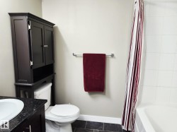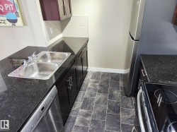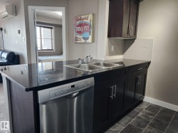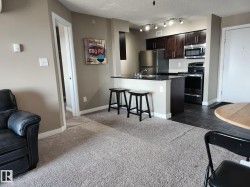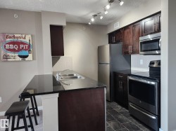 TOP FLOOR Corner Unit with 2 HEATED UNDERGROUND parking stalls, 2 STORAGE UNITS, & IN-SUITE LAUNDRY. Stunning Views! This original owner condo is impeccably clean, beautifully maintained, and offers 2 BEDS + a DEN, 2 full bathrooms, & the comfort of CENTRAL AIR CONDITIONING. Enjoy the privacy & extra light of a top floor corner unit w/ expansive views overlooking GREEN SPACE. Featuring 2 The stylish kitchen is equipped w/ rich dark maple cabinetry, luxurious granite countertops, stainless steel appliances, a breakfast bar, & a dedicated dining area. Abundant windows fill the space w/ natural light, creating a warm, inviting atmosphere. The spacious living room opens to a covered balcony—perfect for relaxing & enjoying the view. The primary suite includes a walkthrough closet & 4-piece ensuite. A generous 2nd bedroom, versatile DEN, & another full bathroom complete the layout. Well maintained building by schools, parks, trails, shopping, public transit, & easy access to henday.