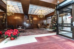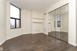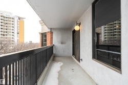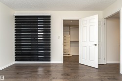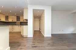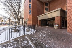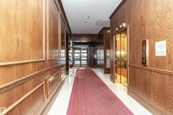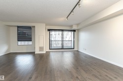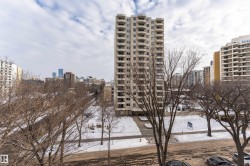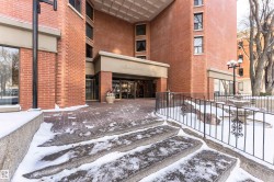 Welcome to Le Marchand Tower one of Edmonton's most prestigious buildings. Conveniently located steps away from the river valley trails, transportation, restaurants, coffee shops, LRT station and with a quick access to the U of A, Brewery District and the Ice District. This fifth floor unit is one-of-a-kind and will not disappoint. It features an open design, 2 bedrooms, hardwood flooring, large living room, white cabinets, granite counters, breakfast bar, huge balcony and a title heated underground parking. The Primary Bedroom is large enough for a king sized bed and has an enormous walk in closet with organizers, plus access to the balcony. In suite laundry. The amenities include a social room with an outdoor area for gatherings, guest suite, and visitor parking. Great price! Fantastic location!