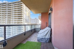 Located in Meridian Plaza, this 2 bed 2 bath condo is MOVE IN READY! The beautiful kitchen showcases SOLID WOOD Delton cabinetry topped with GRANITE countertops, a large island, and brand NEW electric stove (2025), dishwasher (2025), window coverings (2025) and fresh paint! The bright open living room features engineered hardwood floors, electric fireplace, & unobstructed downtown views! Enjoy summer evenings on the large patio equipped with a gas BBQ hookup. The primary suite offers a spacious walk-in-closet with built-ins & a luxurious 5 pc ensuite! The 2nd bedroom is generously sized with more city views & a walk-in-closet. Additional highlights include A/C, title underground parking, & in-suite laundry. Meridian Plaza offers exceptional amenities - fitness centre, owners lounge, guest suite, impressive atrium, and event space. Perfectly located within walking distance to everything downtown--restaurants, shopping & public transportation. The perfect property that blends comfort, style & convenience!