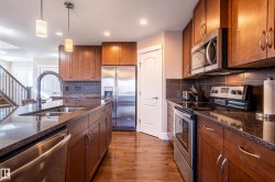 Welcome to this beautiful 2-storey home located in the desirable community of Langdale, Windermere. This family-friendly property sits on a regular lot (not a zero lot line) and features an oversized double garage, elegant hardwood and ceramic tile flooring, and a cozy gas fireplace. The spacious kitchen offers granite countertops, stainless steel appliances, and plenty of counter space for cooking and entertaining. Upstairs, you’ll find a large bonus room, two generous-sized bedrooms, and a primary suite with a walk-in closet and luxurious ensuite bath. The interior staircase design allows for a potential separate side entrance to the basement, offering great flexibility for future secondary suite. Enjoy warm summer evenings in the beautifully landscaped, low-maintenance backyard with a large deck and gazebo. Conveniently located near parks, schools, and shopping, this home is move-in ready!