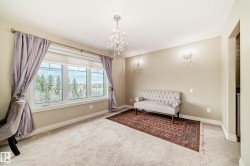 Experience refined luxury in this one-of-a-kind estate on a private walkout ravine lot in Jaguar Ridge, custom-built by Carriage Homes. This elegant residence offers 3 living areas, 3 dining areas, 4 bedrooms, 5 bathrooms, and an oversized heated triple garage. A grand entrance with 19-ft ceilings, a curved staircase, natural light, and hardwood flooring leads to a greeting room, formal dining, and an open-to-above great room. The chef’s kitchen connects to a full dining area with access to the covered deck and a dual-sided fireplace overlooking nature. The main floor includes a bedroom with a 3-pc ensuite. Upstairs features a bonus room, a spacious primary suite with private balcony, 5-pc spa ensuite, and dressing room, plus two additional bedrooms with ensuites. The walkout basement, with three entrances, 9-ft ceilings, rough-ins, and a planned two-sided fireplace, is ready for development. Stunning chandeliers and detailed wainscoting elevate this home’s timeless elegance. Made for classy living!
