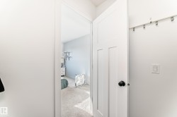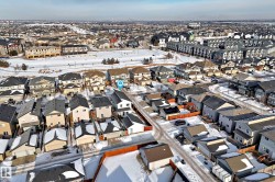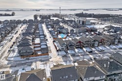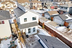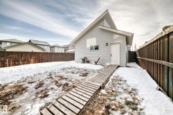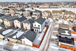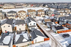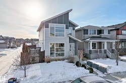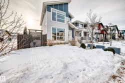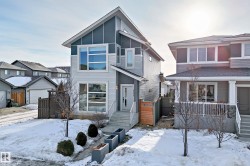 DESIGN-DRIVEN, HUGE WINDOWS, END LOT! This bright and gorgeous 1,631 sqft two-storey blends modern style with everyday comfort. Enter to an open-concept main floor featuring high ceilings, a fireplace feature wall, and dramatic floor-to-ceiling windows that frame the space beautifully. The kitchen is designed for both hosting and daily life, a generous island with seating and waterfall quartz countertops, extra-height cabinetry, upgraded stove, sink, backsplash, and statement lighting. A 2-pc bath and mud room area round out the main floor. Upstairs, the primary suite offers a walk-in closet and a 4-piece ensuite, complemented by two additional bedrooms and a full bath. The basement provides a huge, finished family room, room for a future fourth bedroom and bathroom, plus laundry and utilities. The end-unit location along the alley creates a wider yard ready for your creative touch. Double detached garage with tall ceiling for potential storage. Great location in family-friendly Chappelle. Welcome home!